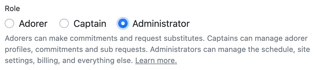 To add an administrator or a captain, visit Admin » Adorers, click New Adorer, fill out the form, and select Administrator or Captain from the Role field.