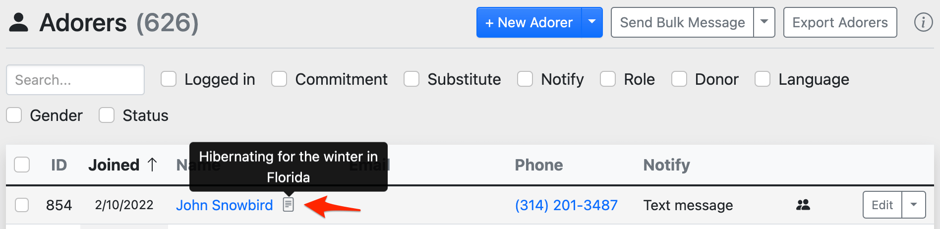 Notes are also displayed after each adorer's name at Admin » Adorers.
