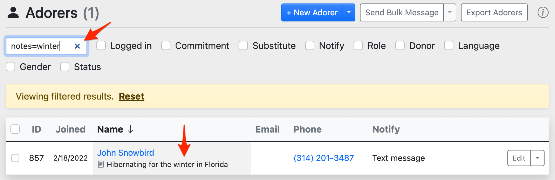 For example, searching for winter filters the list of adorers to those with the word "winter" in their name, internal notes, email address, etc.