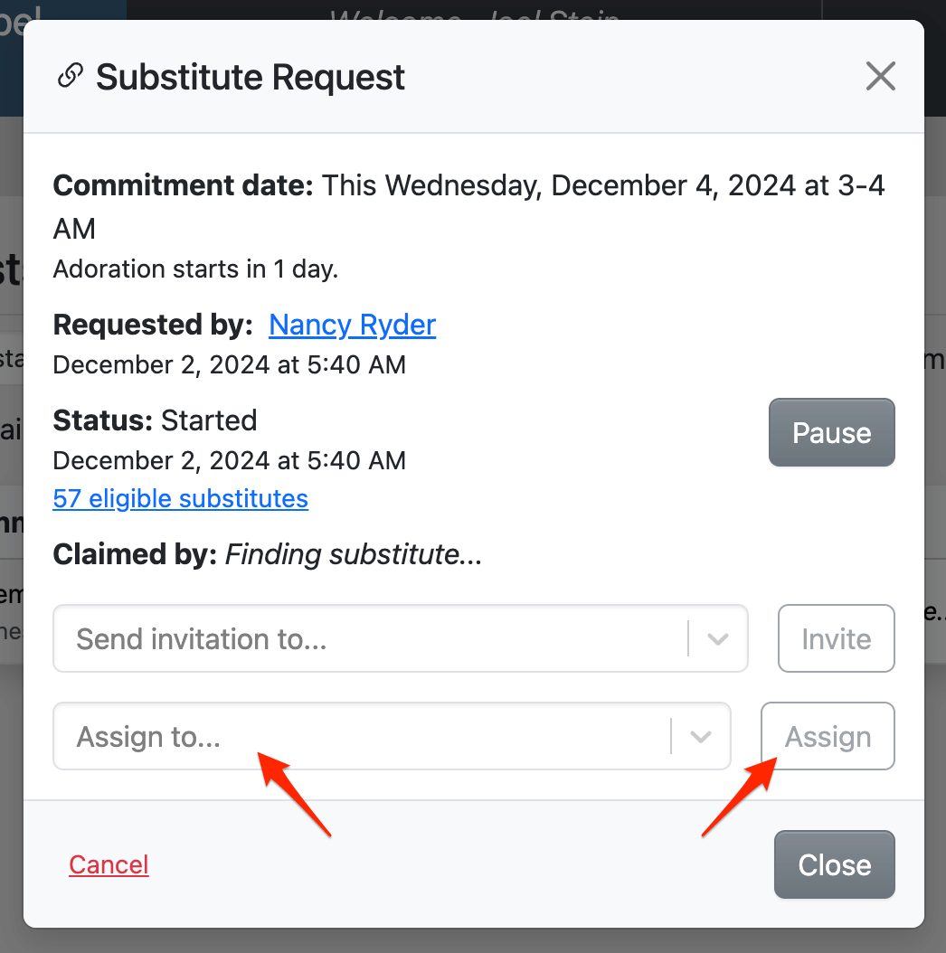 Administrators and captains can assign open substitute requests to an eligible adorer (e.g., non-blocked adorers not already signed up at that time).