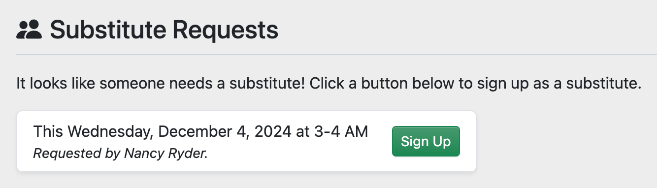 Open substitute requests are displayed on each adorer's Dashboard page. Adorers can click the Sign Up button to claim this substitute request and make a one-time commitment.