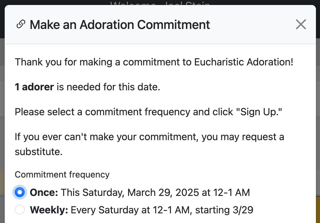 We don't recommend enabling the Monthly commitments frequency because it can be cumbersome to fill up a weekly adoration schedule—however, some chapels like offering this option.