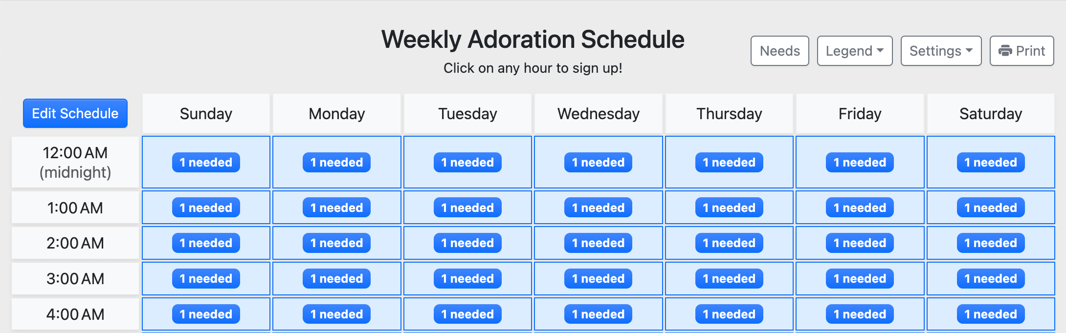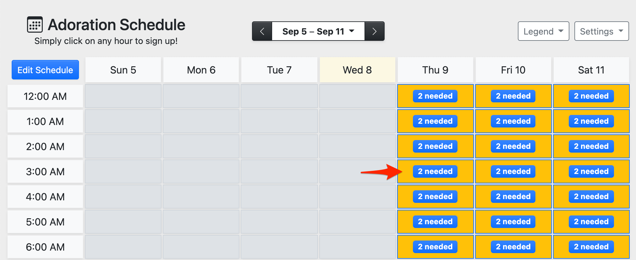 You can also visit any adorer's Dashboard page and click Sign Up on an hour in the vertical list of open hours. Optionally filter the list to show hours needing an adorer.