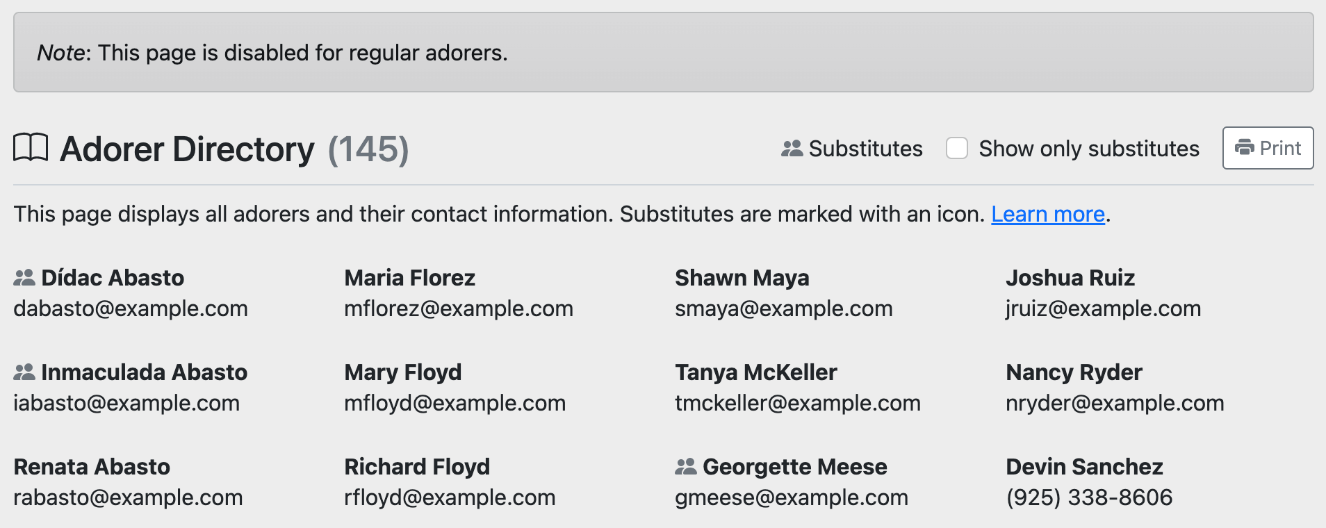 The Directory page displays limited information (names and contact information) for all your adorers.