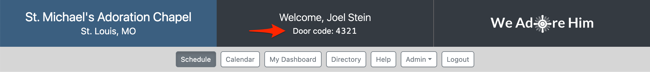 If you selected Each adorer uses a different door code, then administrators and captains can enter a door code for each adorer by editing their account. Each adorer will see their own door code in the header of the website when they are logged in, beneath their name.