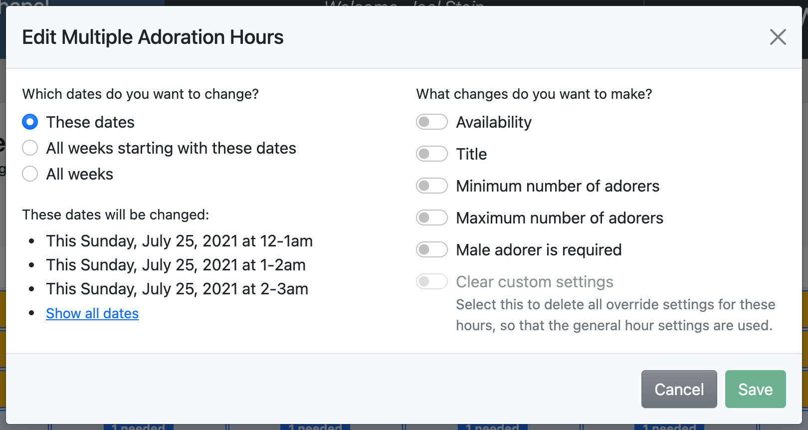 These dates: this option adds customized settings for the selected dates, overriding each hour's general settings. For example, you might use this option to quickly close adoration for some typically open dates.
