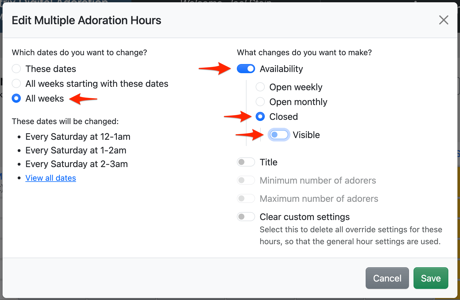 But if your adoration program runs on a limited schedule (e.g., only a few days per week), you might want to display only those hours when you usually offer adoration.