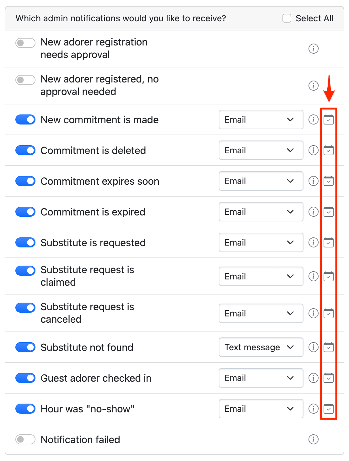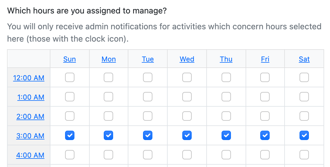 To accomplish this, edit their account and select the admin notifications with the calendar icon next to them. These notifications are only sent to administrators and captains assigned to the corresponding hour for this event.