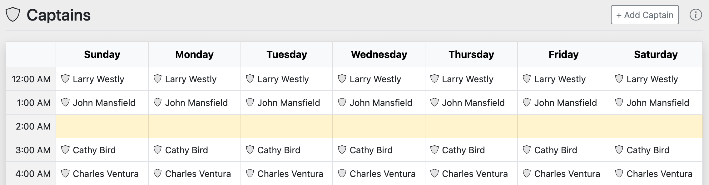 A captain (or administrator) can be assigned to a single hour, a range of hours, a day of the week, etc.
