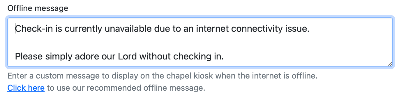 You can customize this message to ask your adorers to check in with paper check-in sheets, call the IT person at the parish, etc.