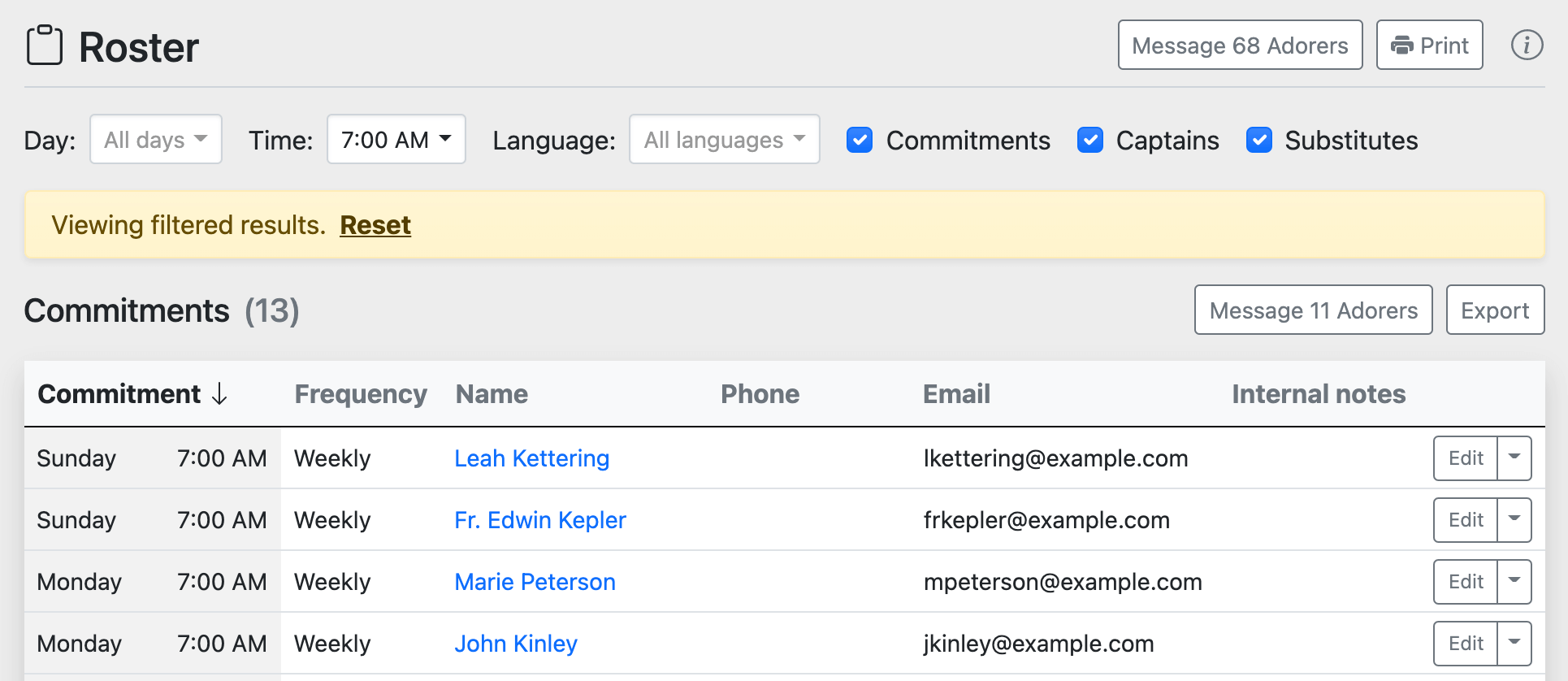 Or, if you are the Monday hourly captain, set the Day filter to Monday and the Time filter to All times. This will show all adoration commitments on Mondays, as well as adorers whose substitute preferences include Mondays.