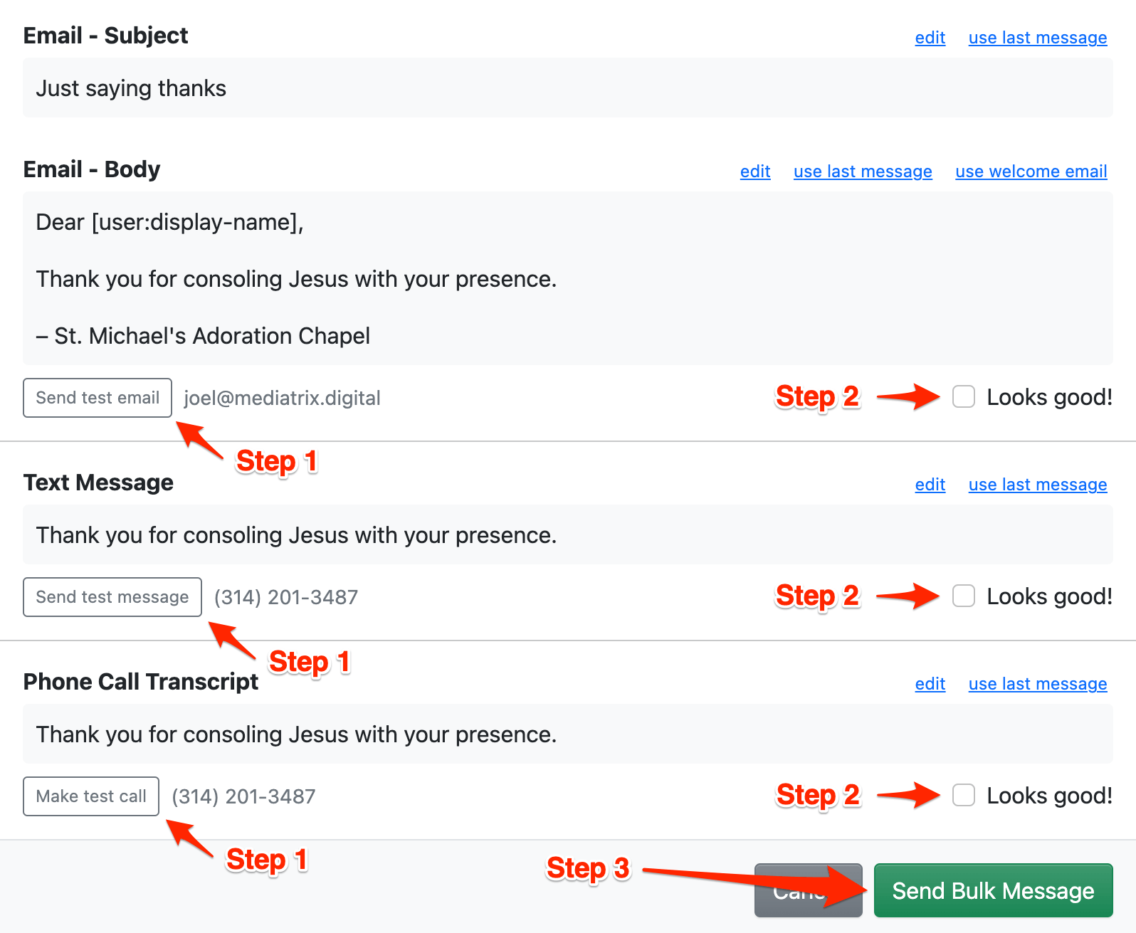 After you have adjusted your message (and sent another test to double-check!), click the Looks good! checkboxes, then click Send Bulk Message.