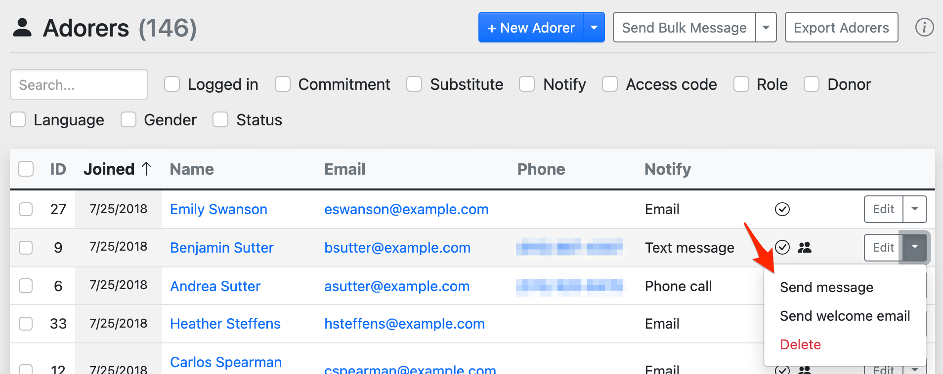 Still, you can send an individual adorer a text message by filtering the Admin » Adorers page to only their name and then clicking Send Bulk Message.