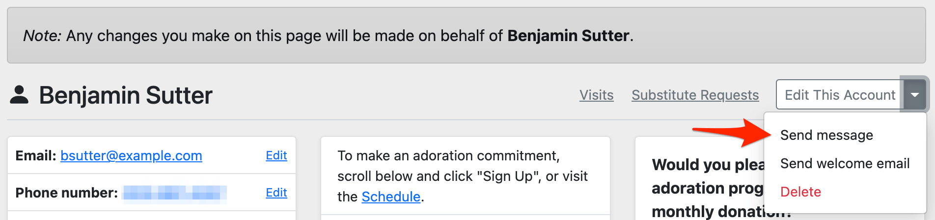 You can also find the Send message button on the adorer's Dashboard page, next to Edit This Account.