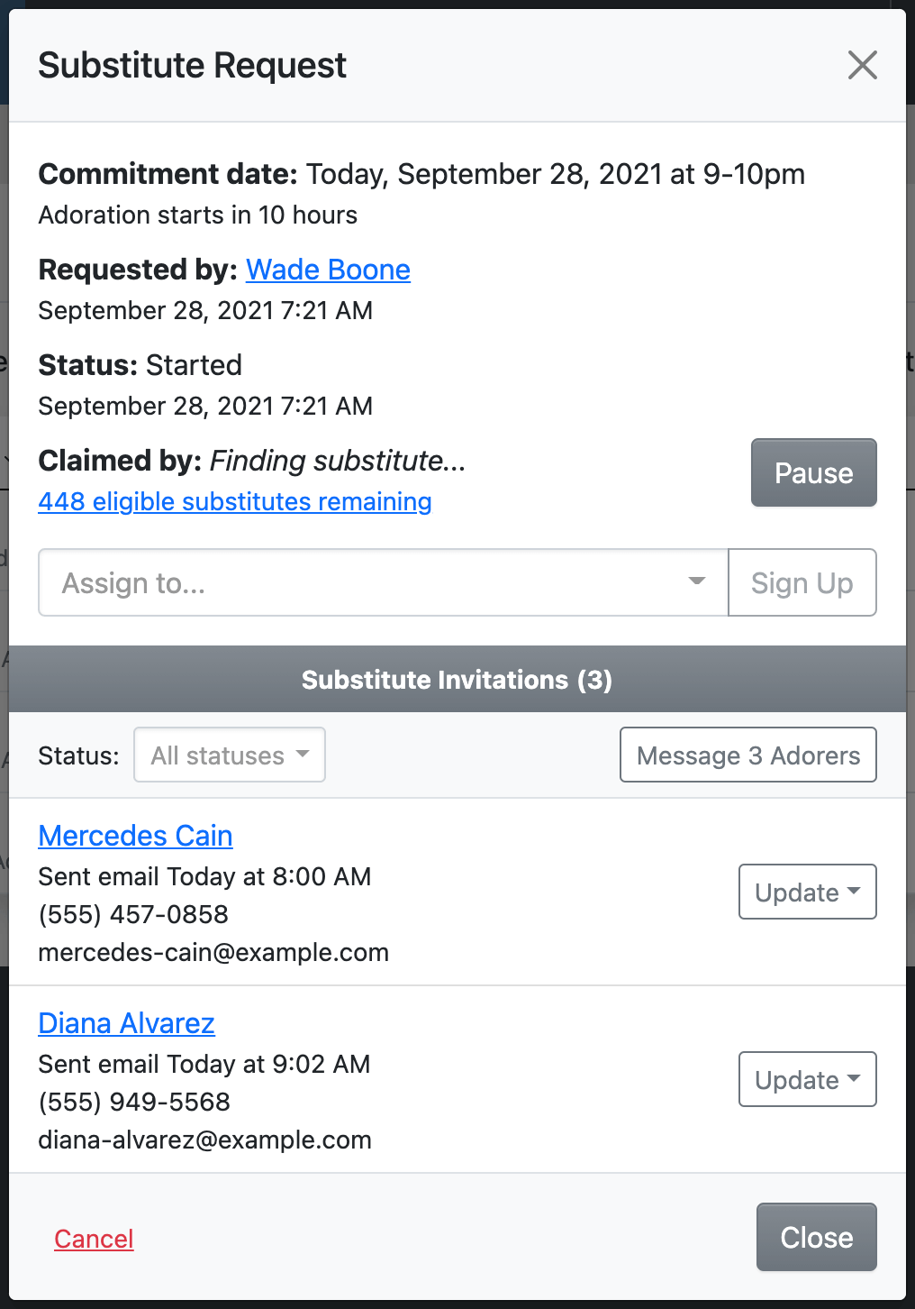 This page also shows the complete history of past substitute requests so that you can see everyone invited for past requests, who declined, who accepted, who didn't answer, etc.