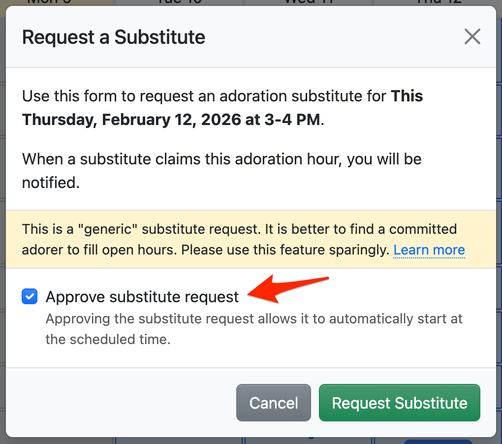 - If your adoration schedule is generally full (having two adorers for every hour) and you want to manually approve only those substitute requests where an adorer is truly needed.