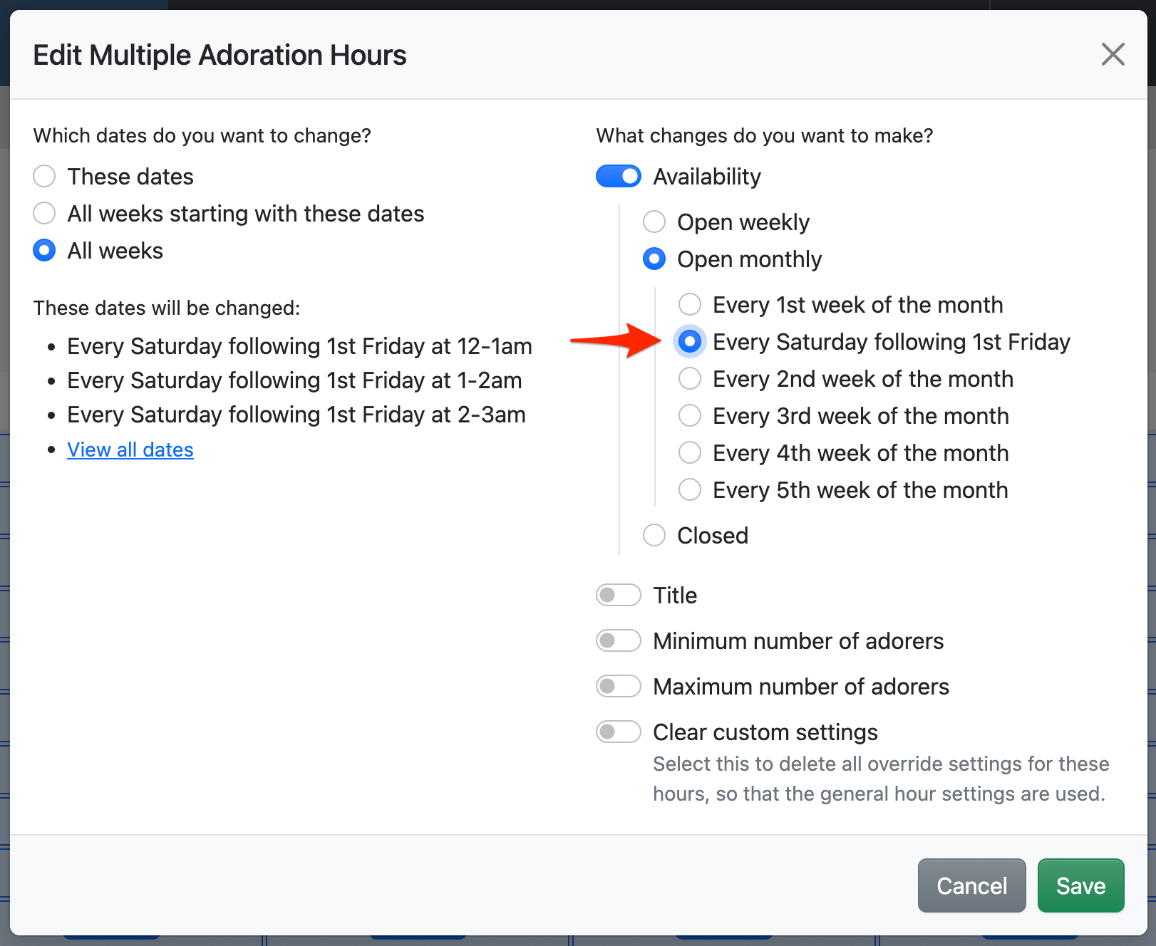 And—if you are already using We Adore Him with Saturday hours configured to Every 1st Saturday, simply update the hours to use this new option, and your corresponding monthly adoration commitments will also be updated! 🎉