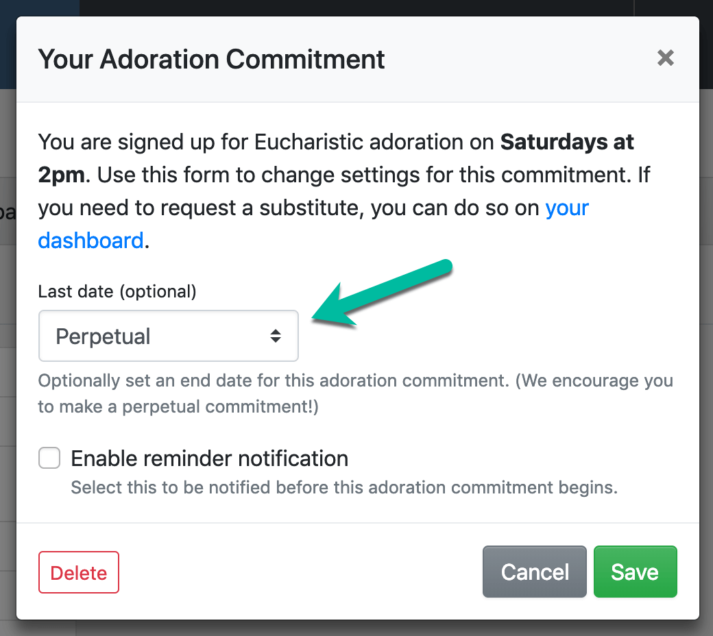 Adorers (or administrators on behalf of adorers) can now add an optional End Date to existing commitments!
