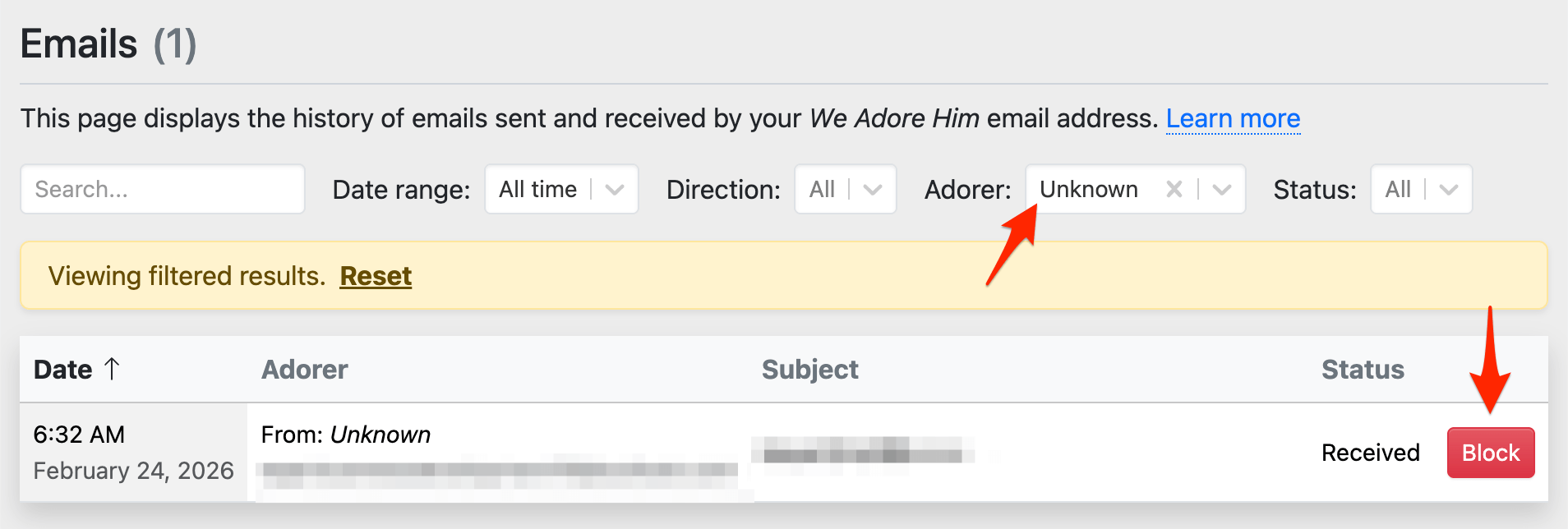 You can now block specific email addresses from the Admin » Emails page. The easiest way to find suspicious senders is to filter the list to show Adorer = Unknown, which displays emails from addresses that don't match any adorer in your system. From there, simply click the Block button next to any address you'd like to block.