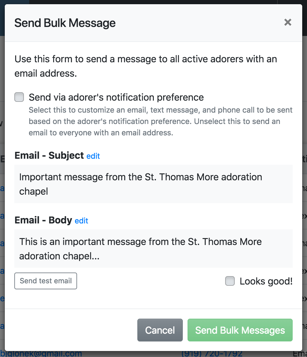 ... You'll notice that you can now bulk email every adorer that has an email address OR send a message to every adorer using their notification preference: email / text message / phone call.