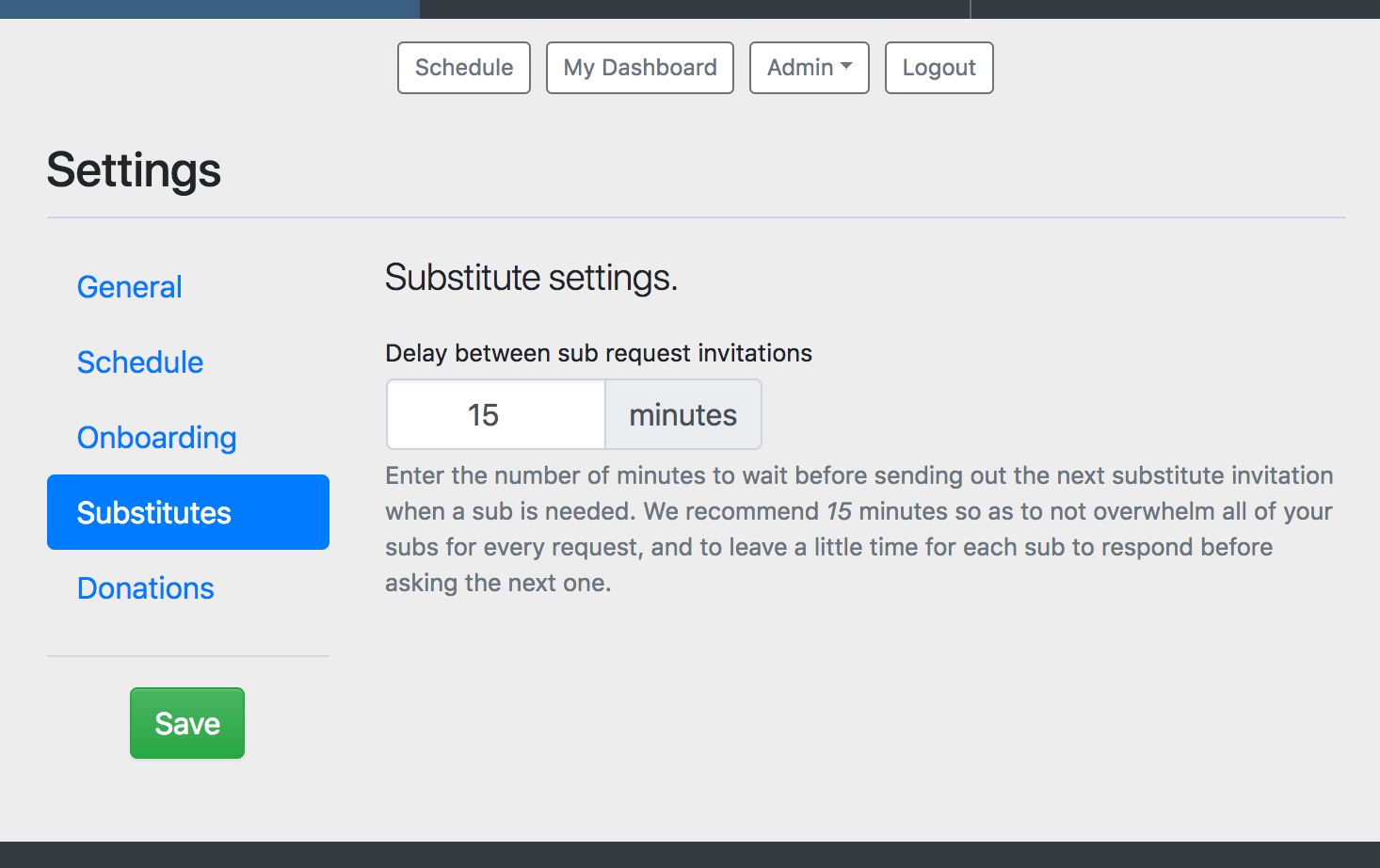 There, you can change the number of minutes to wait before sending out the next substitute invitation when a substitute is needed.