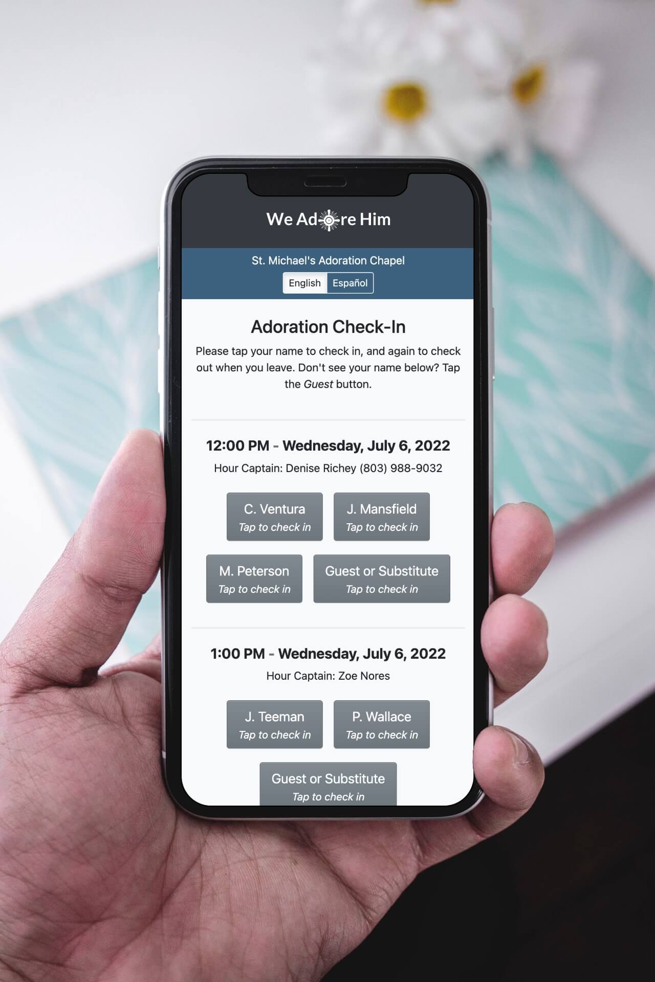 - The Adoration Check-In Kiosk opens on their phone's browser, where they can check in and out.