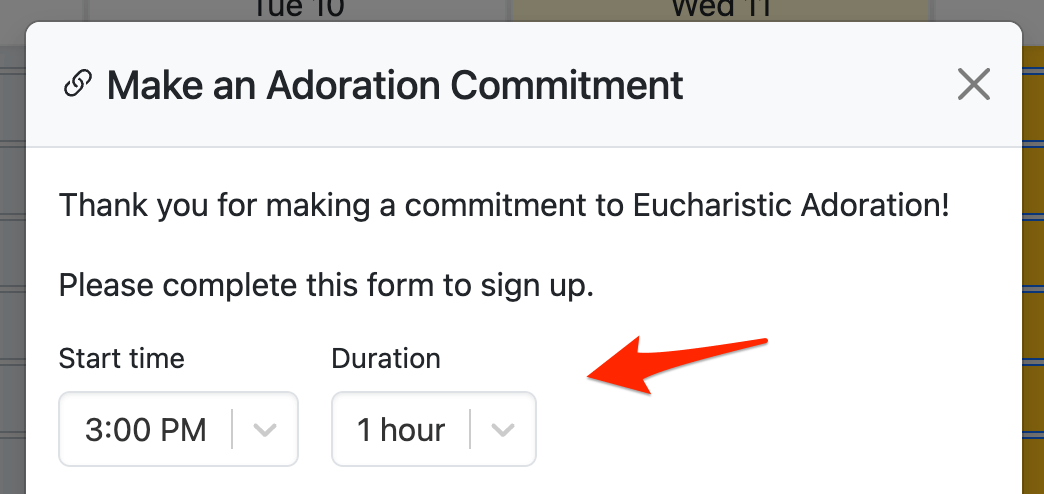 When this feature is enabled, adorers can adjust their commitment's start time up to 30 minutes before or after the top of the hour. Combined with expanded duration options, this gives you the flexibility to handle just about any schedule.