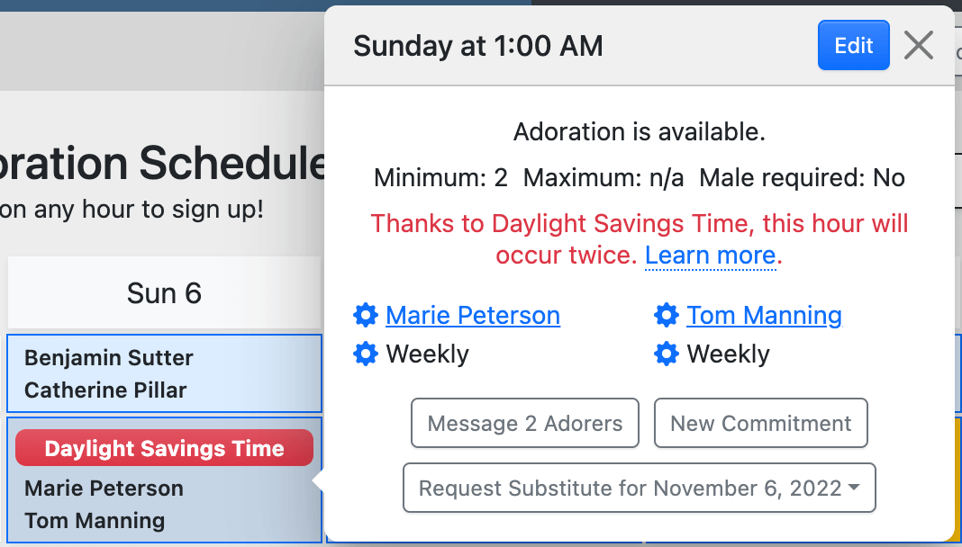 If you plan to have adoration during that second 1:00 AM hour, we recommend you sign up two people for the 1:00 AM hour and then ask one of them to take the second 1:00 AM hour.