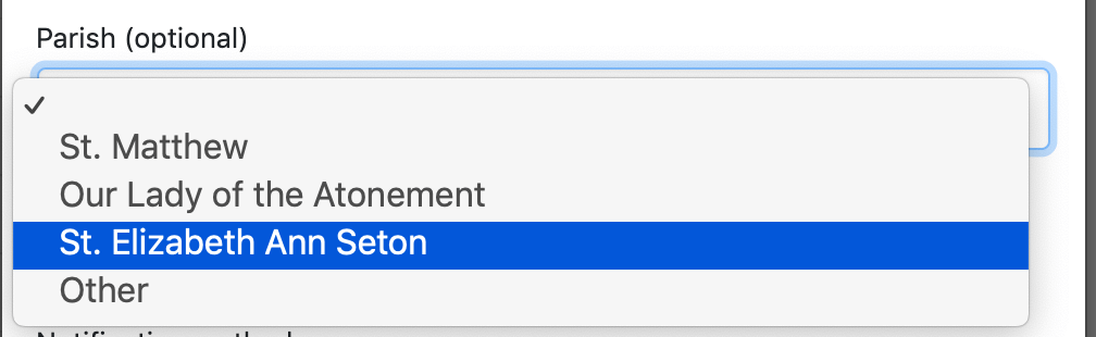 Then, when folks sign up for a commitment online, they'll be able to choose their parish. If their parish isn't listed, they'll be able to type it in under "Other."