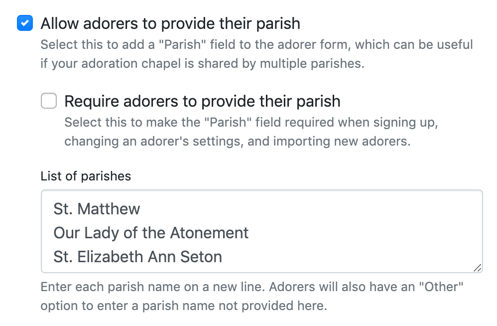 To turn this on, simply visit Admin » Settings » Onboarding. Then, check the box next to: "Allow adorers to provide their parish."