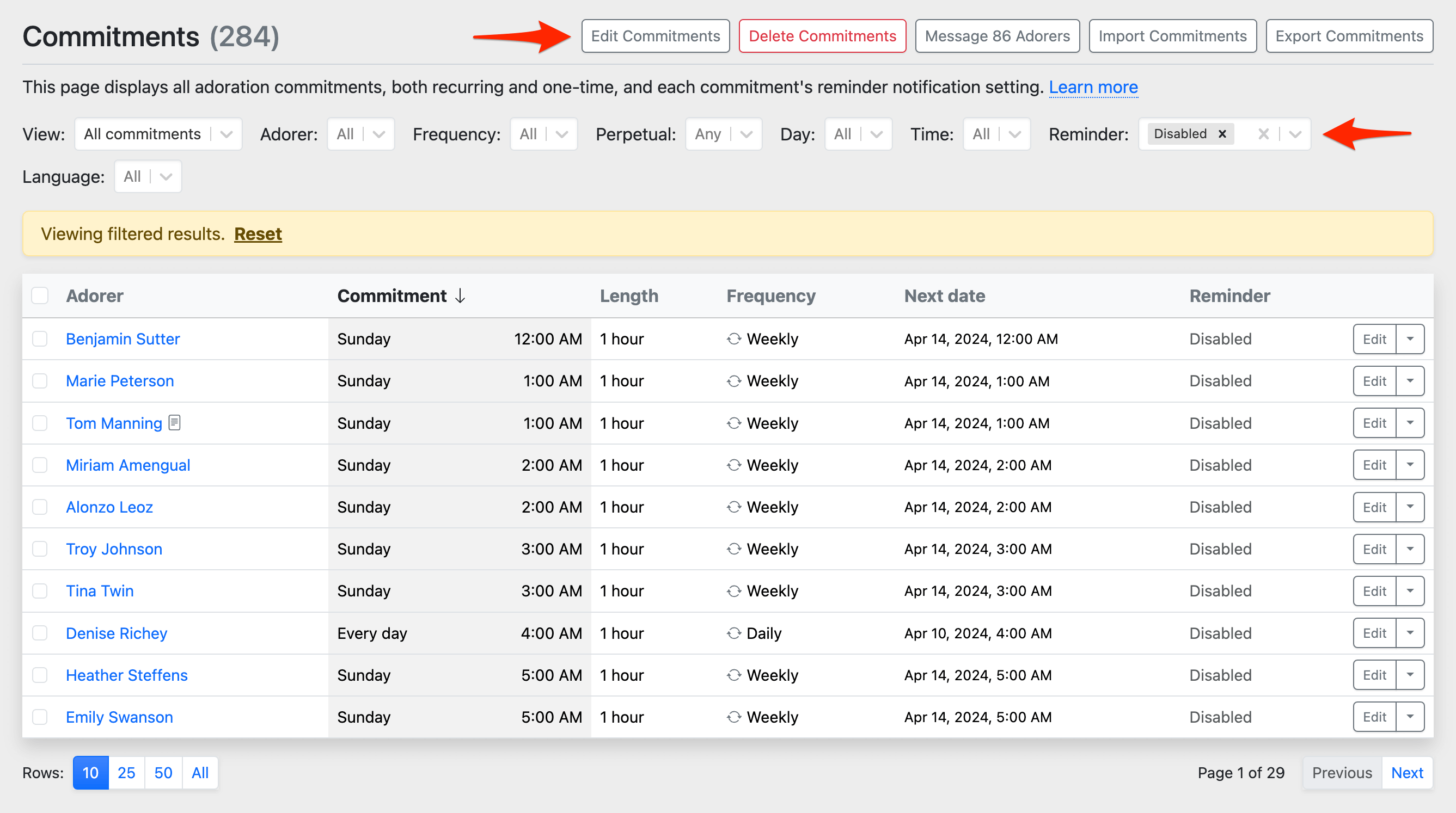 First, go to Admin » Commitments and either (a) filter the list of commitments or (b) select the checkboxes next to the commitments you wish to edit.