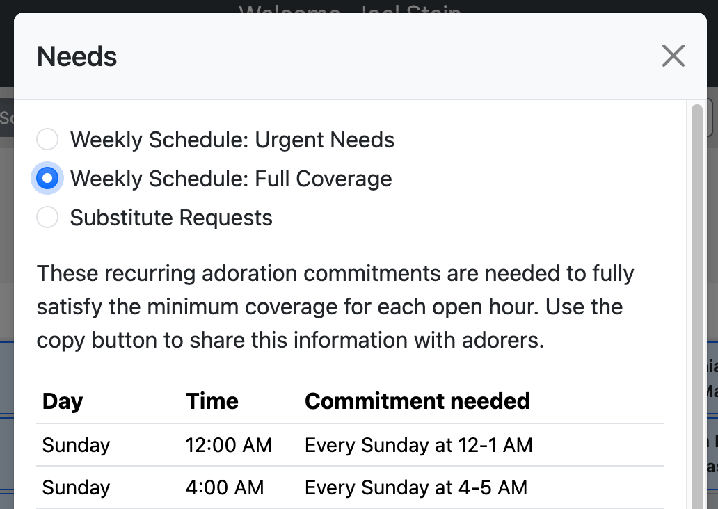 To use it, click Needs on the Schedule page and select Weekly Schedule: Full Coverage. Then copy and paste the list into your parish bulletin, email, or text message—just like before!