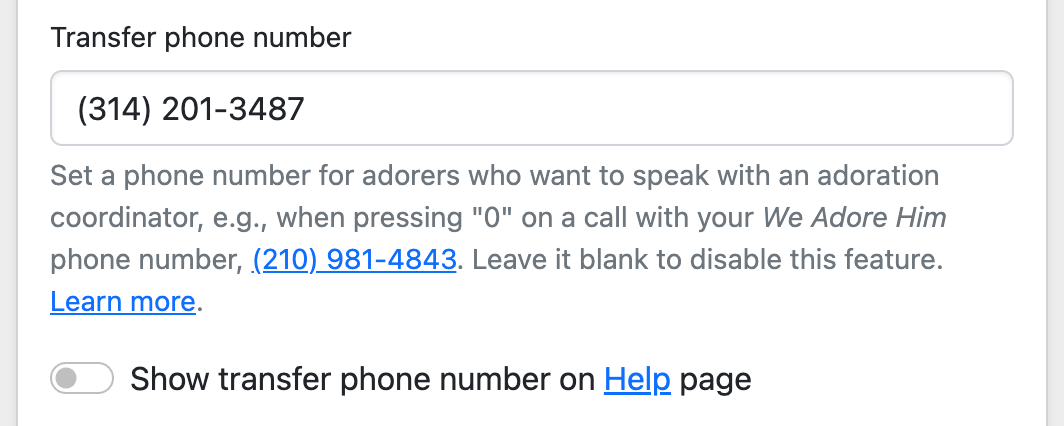 2. We added an option to hide the Transfer Phone Number on the Help page.