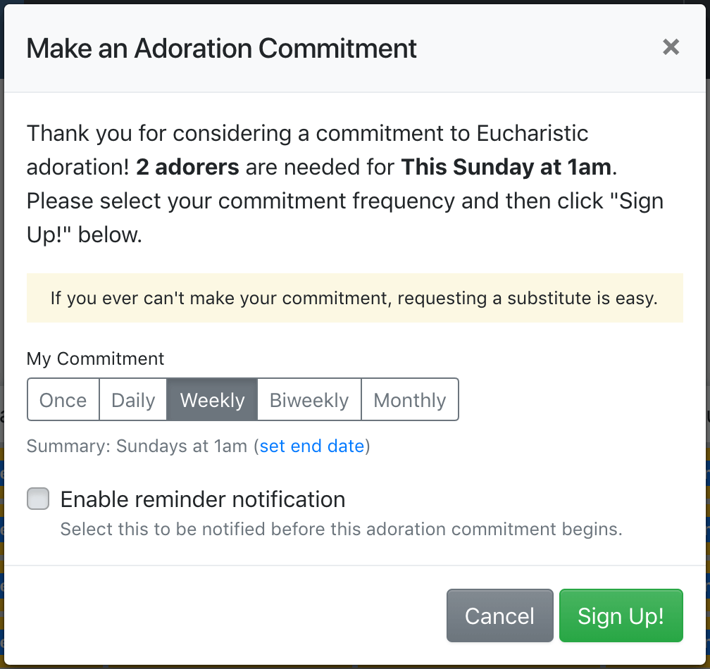 Then, when folks are signing up for an adoration commitment, they'll be able to choose from the options, which now appear as buttons:
