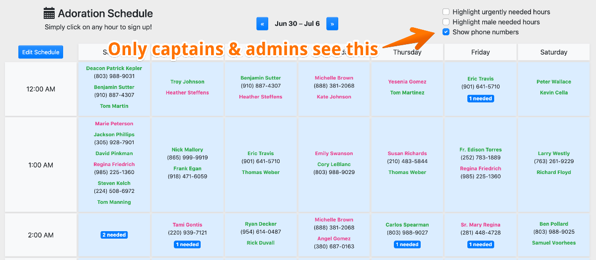 If you are a Captain or an Administrator, you will see a new option on your Schedule page to "show phone numbers" like this:
