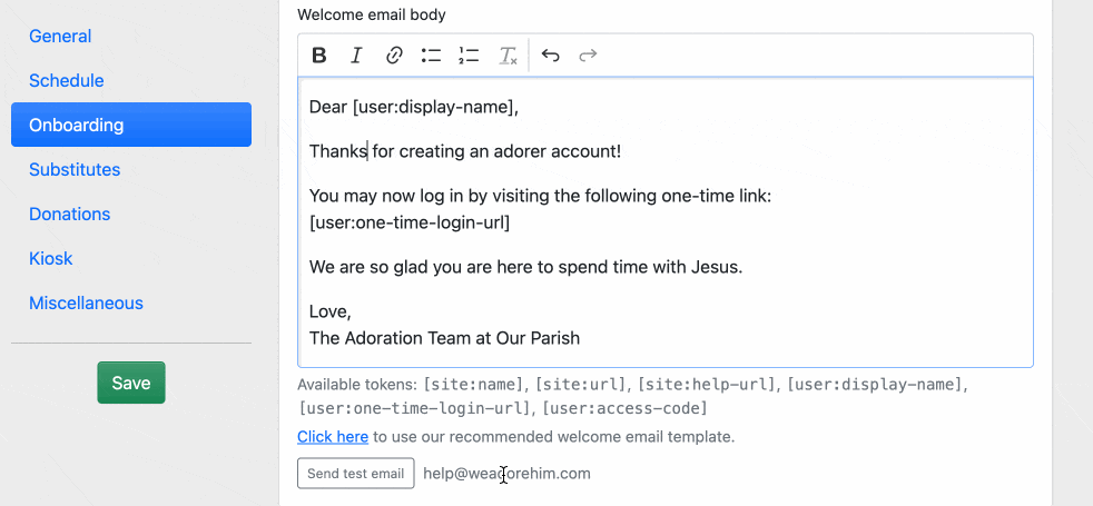 To preview the welcome email at Admin » Settings » Onboarding, click the Send test email button below the Welcome email body field.