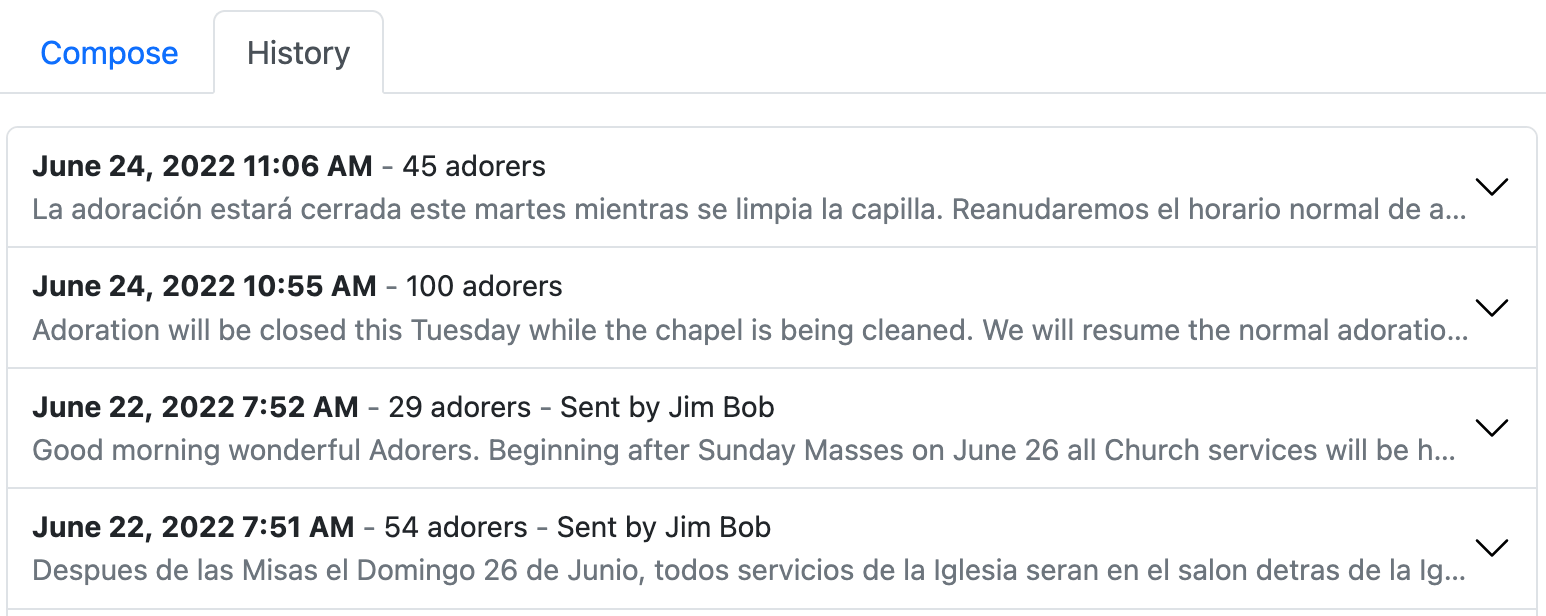 Click a message to expand it. Review each message part (email, text message, phone call transcript) and how many adorers were contacted.