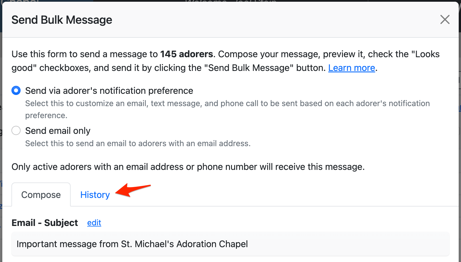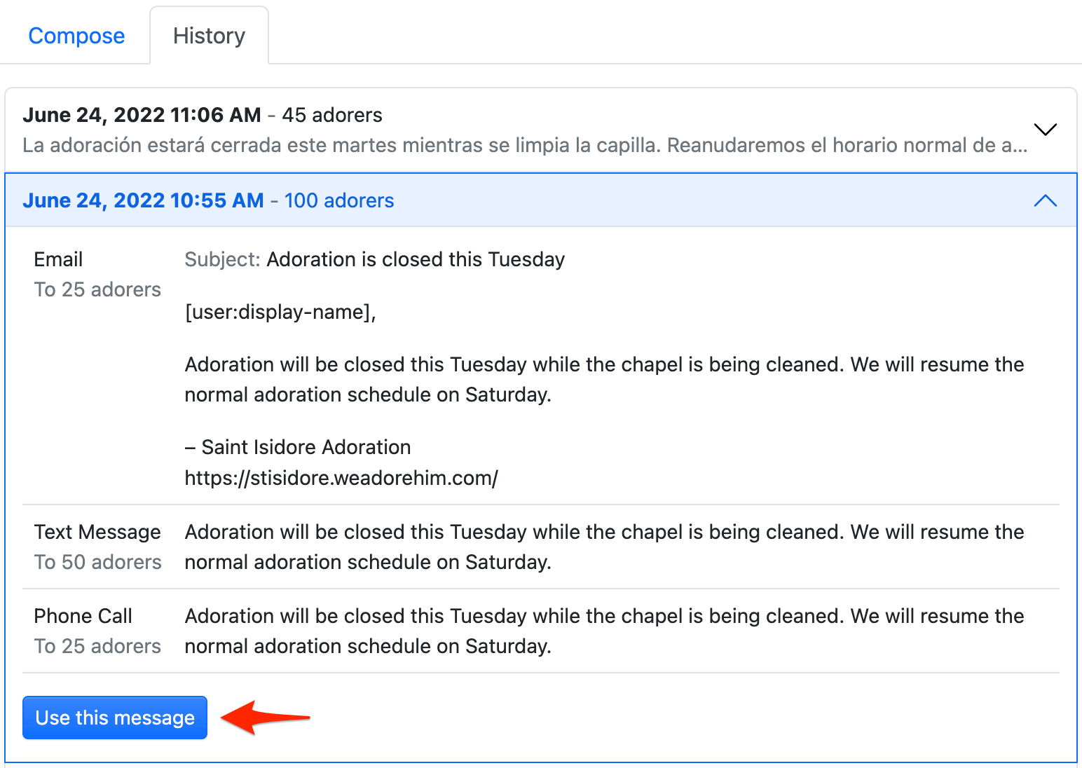 Once you find the message to resend, click the Use this message button to replace your draft bulk message. Make any desired edits, proof it, and send away.