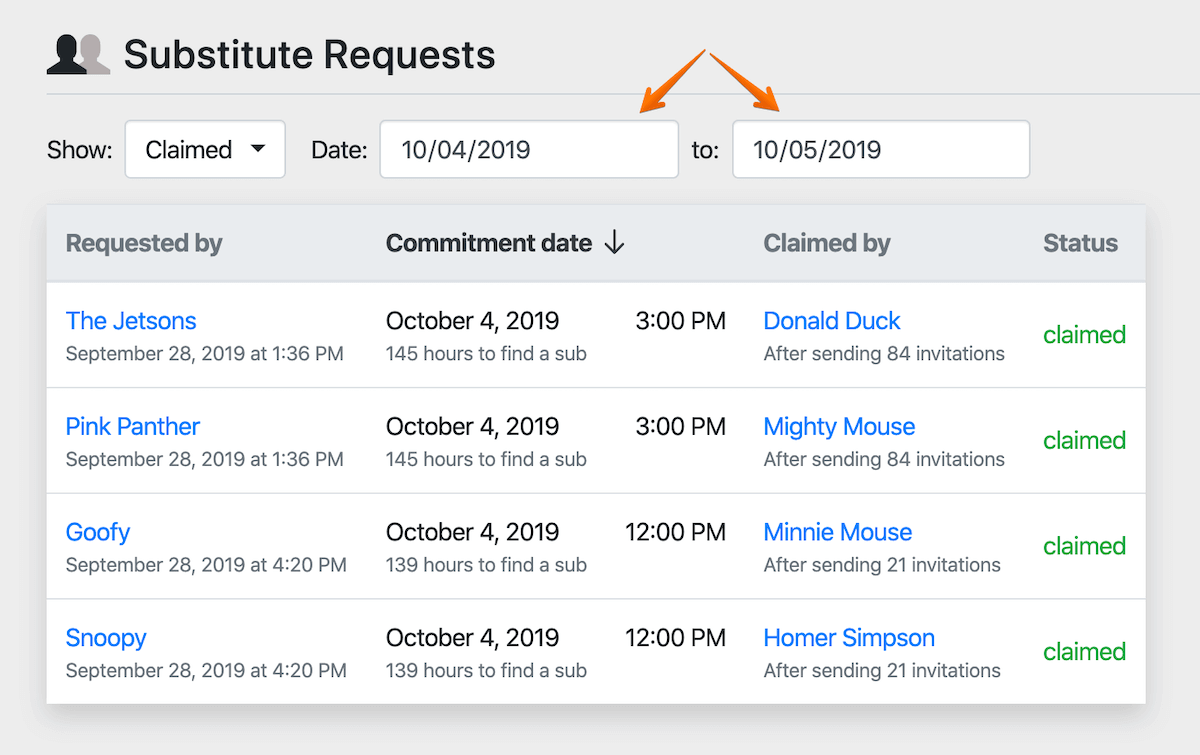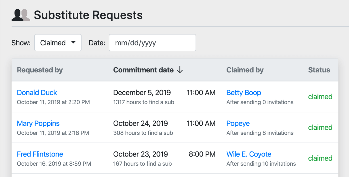 If you choose "Claimed," you'll see an informative table view of all past claimed substitute requests with informative details as seen in the screenshot below:
