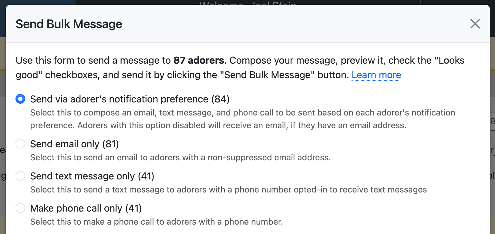 When sending a bulk message, you've always had the option to send via each adorer's preference or via email only. Now you have two more options: text message only and phone call only.