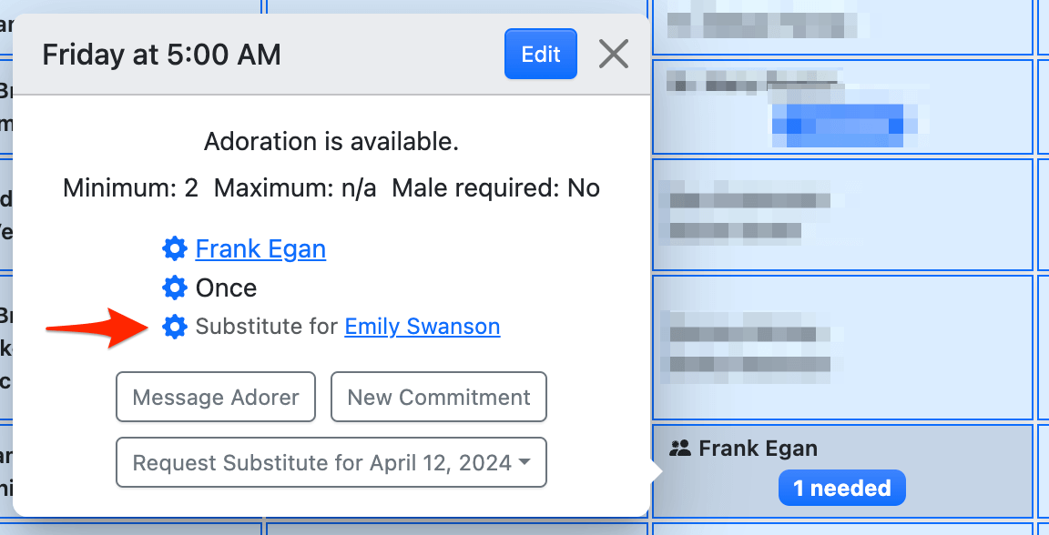 When hovering over a future hour having a substitution commitment, you'll see the name of the originally scheduled adorer.